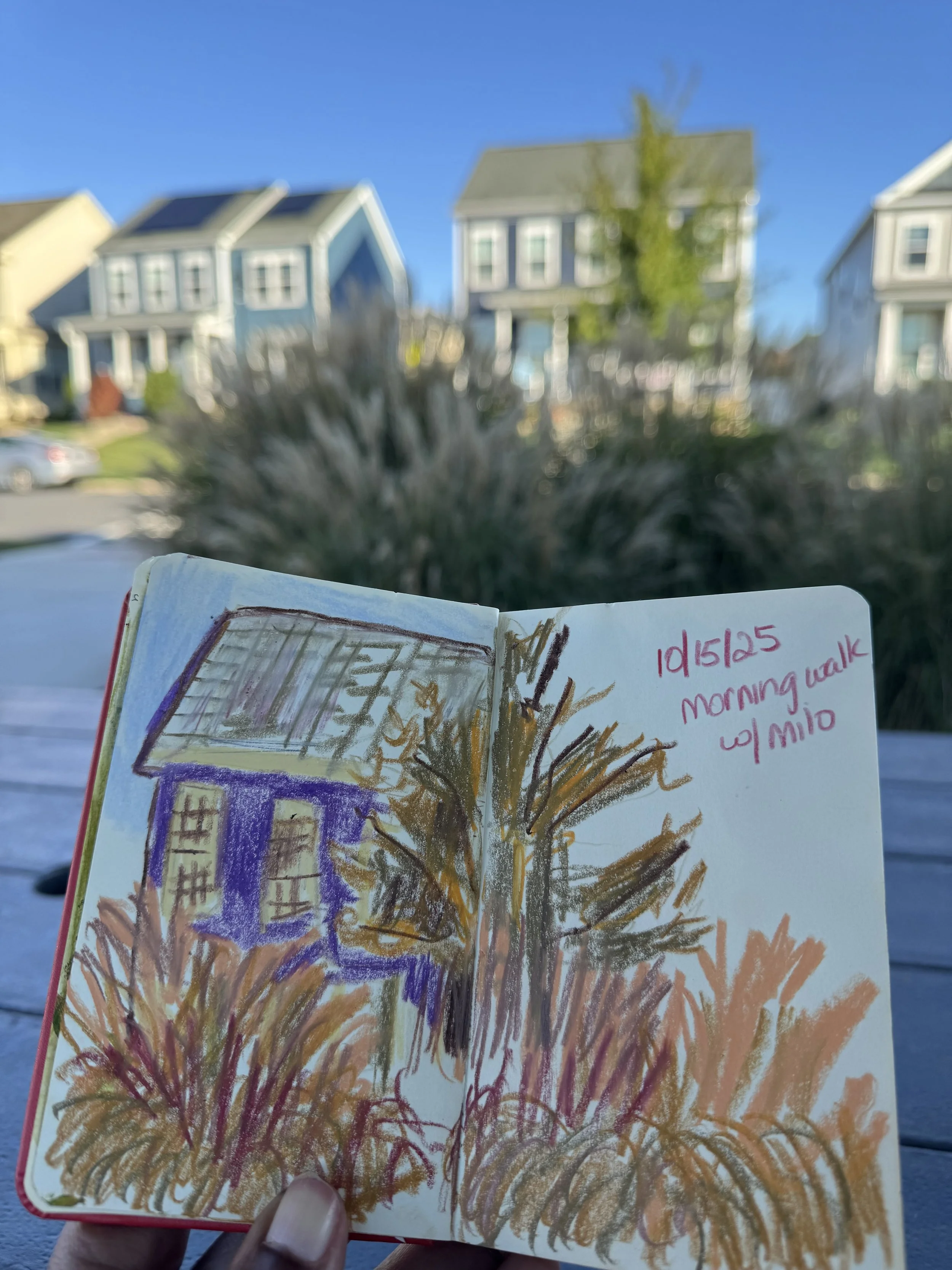 I wanted to sketch in my sketchbook more often, so I paired it with my daily morning walk with our dog, Milo. These days, I tuck a small sketchbook and either my Neocolor II crayons or a tiny gouache set into my fanny pack before we head out. After Milo’s had his fill of sniffing and wandering, I find a bench in the neighborhood, sit for a few minutes, and sketch the turning autumn leaves before heading home.